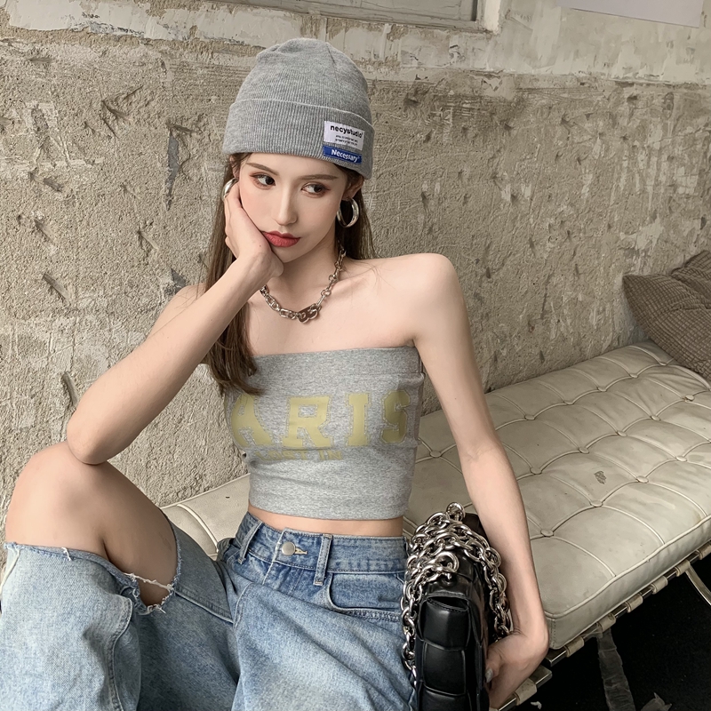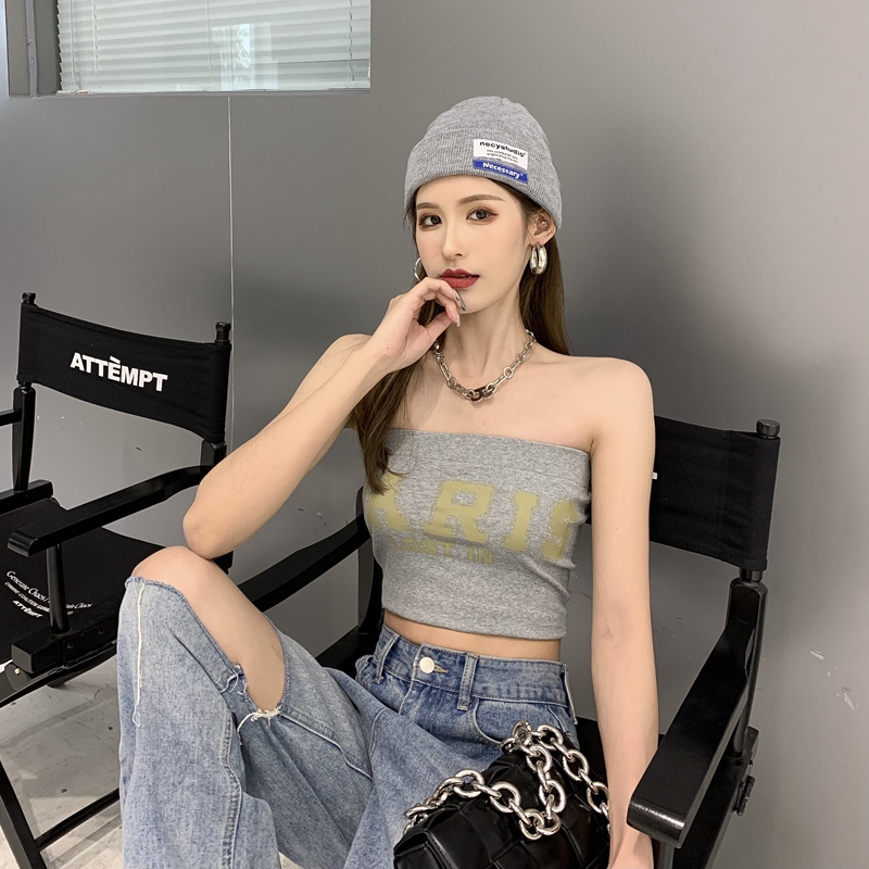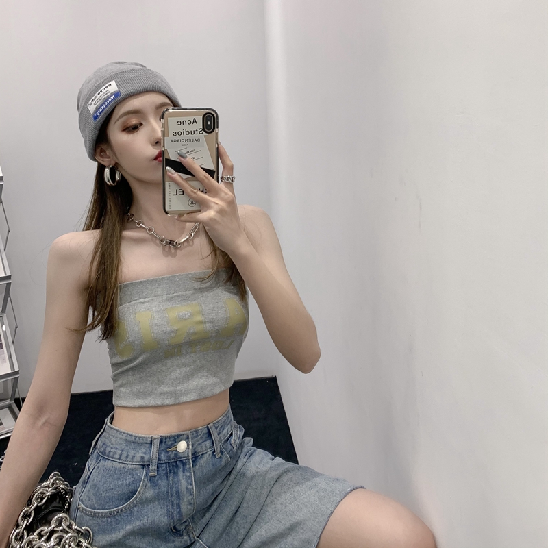 봄과 여름의 실제 사진 홍콩 스타일의 핫 걸스 스타일 편지 인쇄 슬림하고 슬림하고 슬림하고 배꼽과 조끼가 스트랩 탑으로 드러납니다.