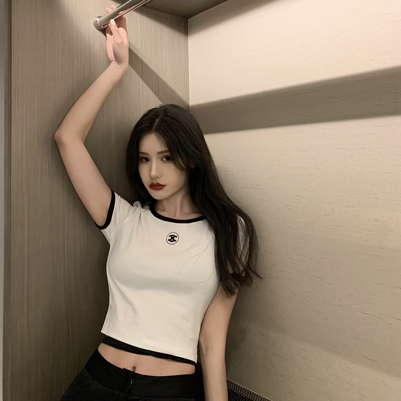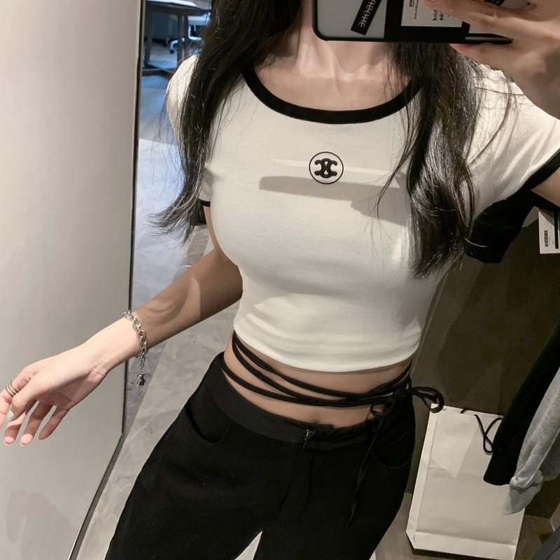 실제 홍콩 스타일의 스푸핑 소형 향수 스타일의 짧은 고팔 티셔츠 여성을위한 슈퍼 인기있는 인터넷 유명 인사