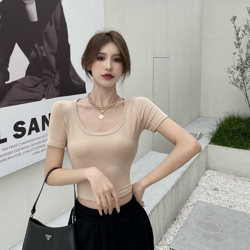 봄과 여름 홍콩 스타일의 핫 걸 스타일 U-Neck 단단한 스트레치 짧은 짧은 슬리브 티셔츠 작은 섹시 배꼽 탑의 실제 사진
