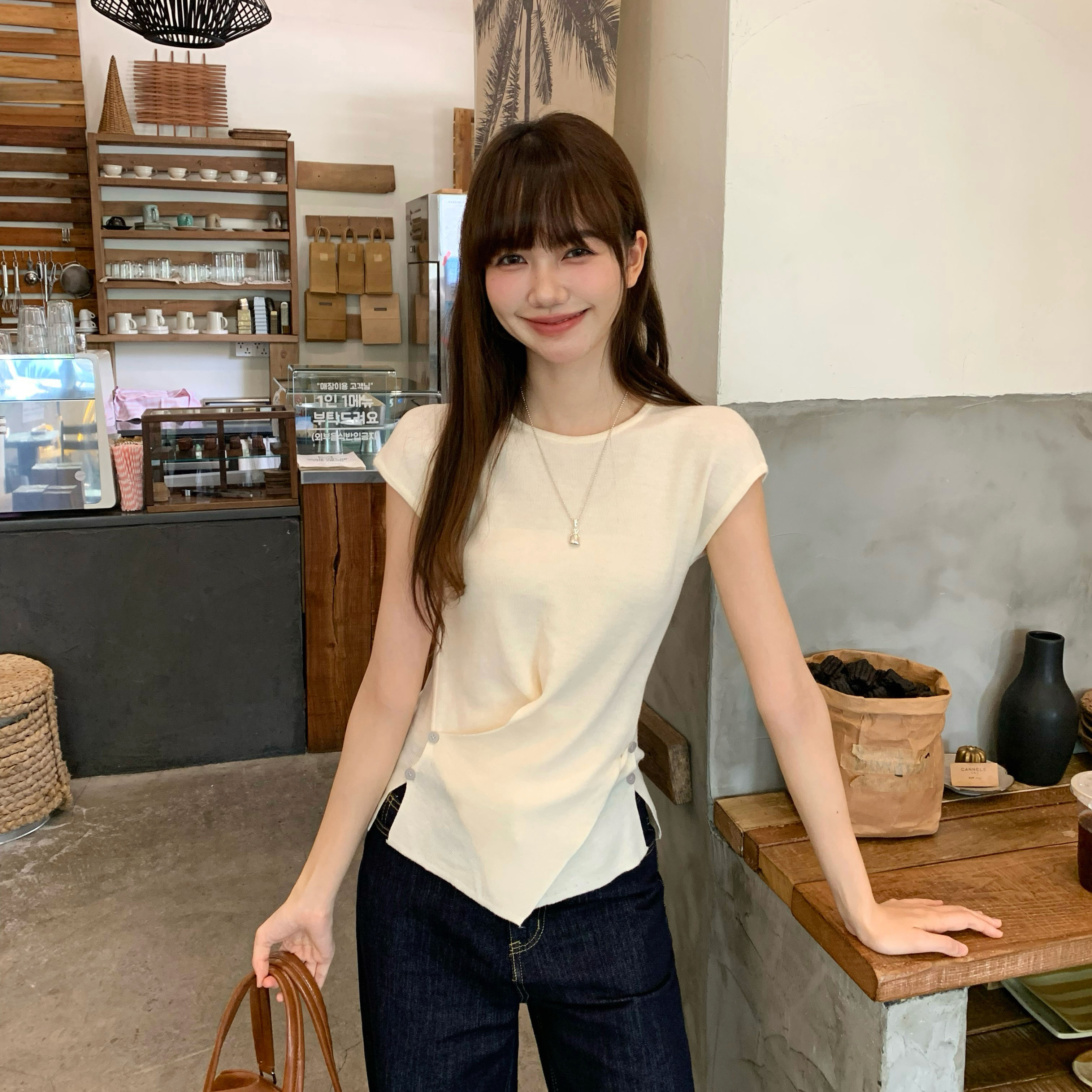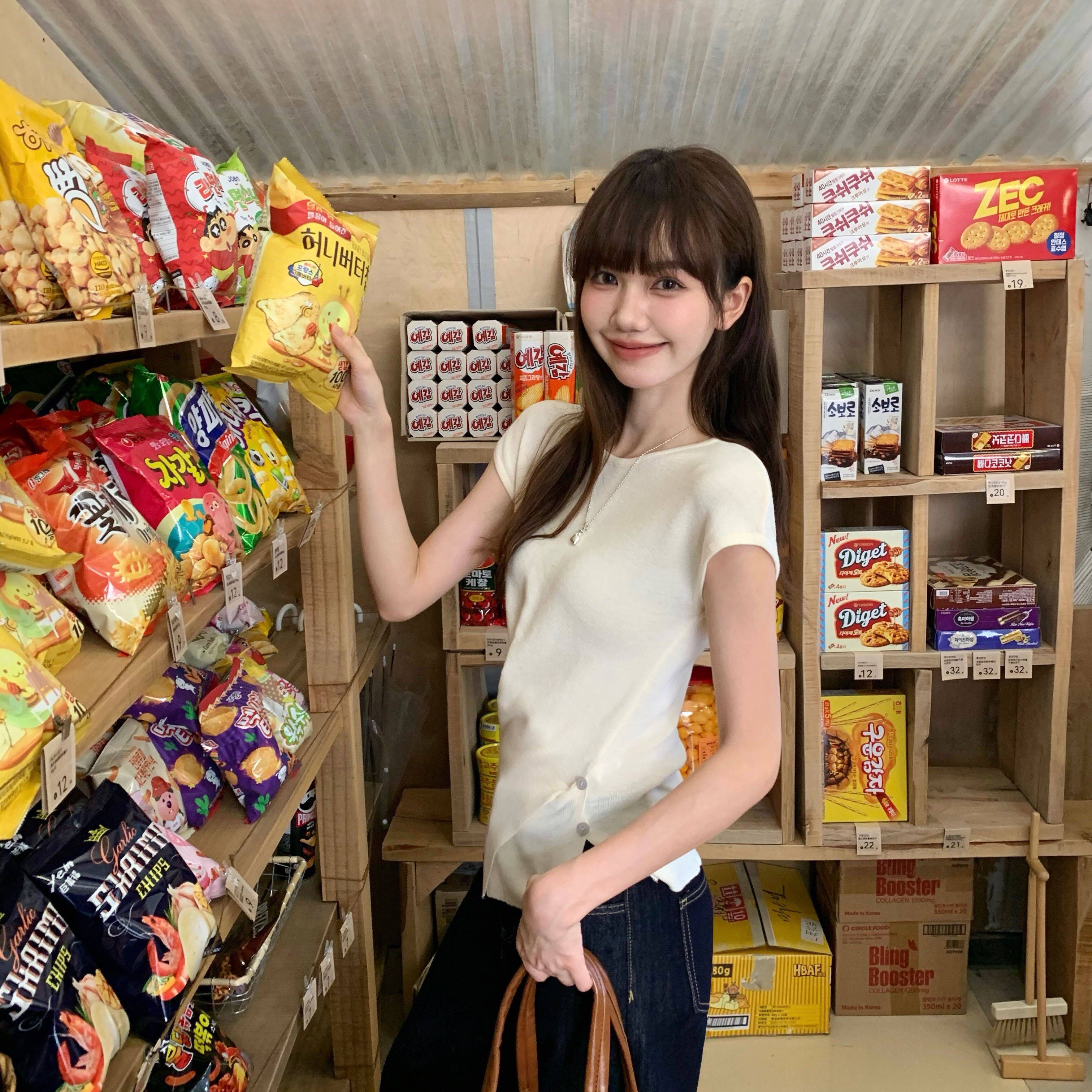 실제 가격#옐로우 불규칙한 니트 짧은 슬립 티셔츠 여름에 여성을위한 2025 년 새로운 스타일 허리 크로스 크로스 슬림 피트