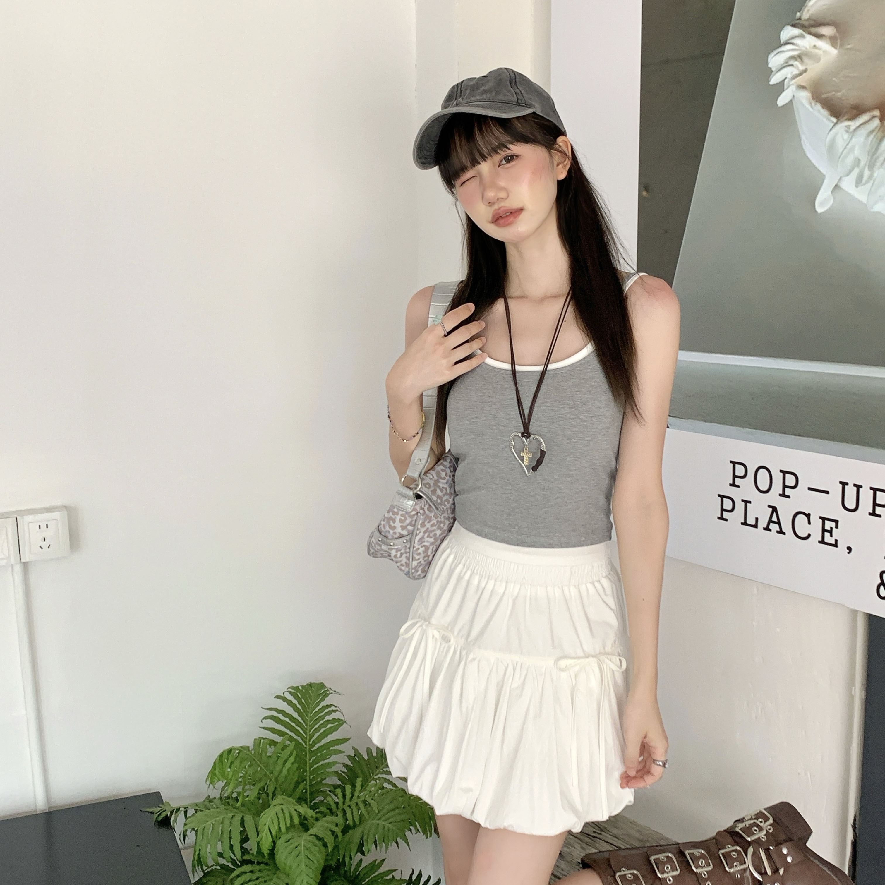 실제 샷 및 실제 가격#회색 가짜 2 피스 여성을위한 작은 서스펜더 조끼 2025 여름 뉴스 스타일 슬림 짧은 슬리브 레스