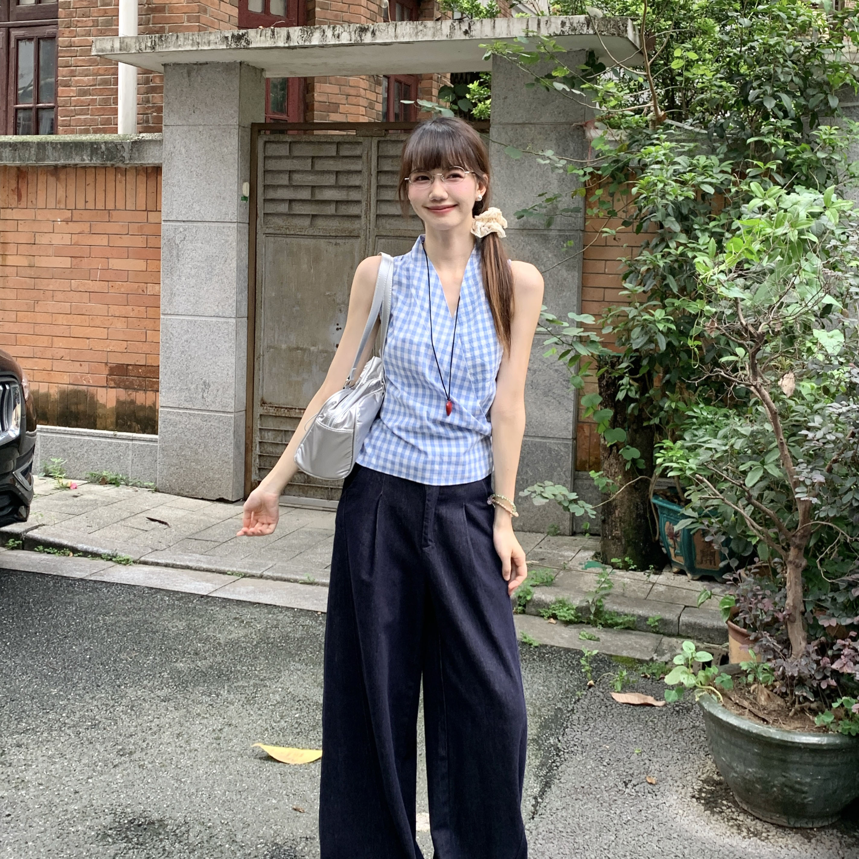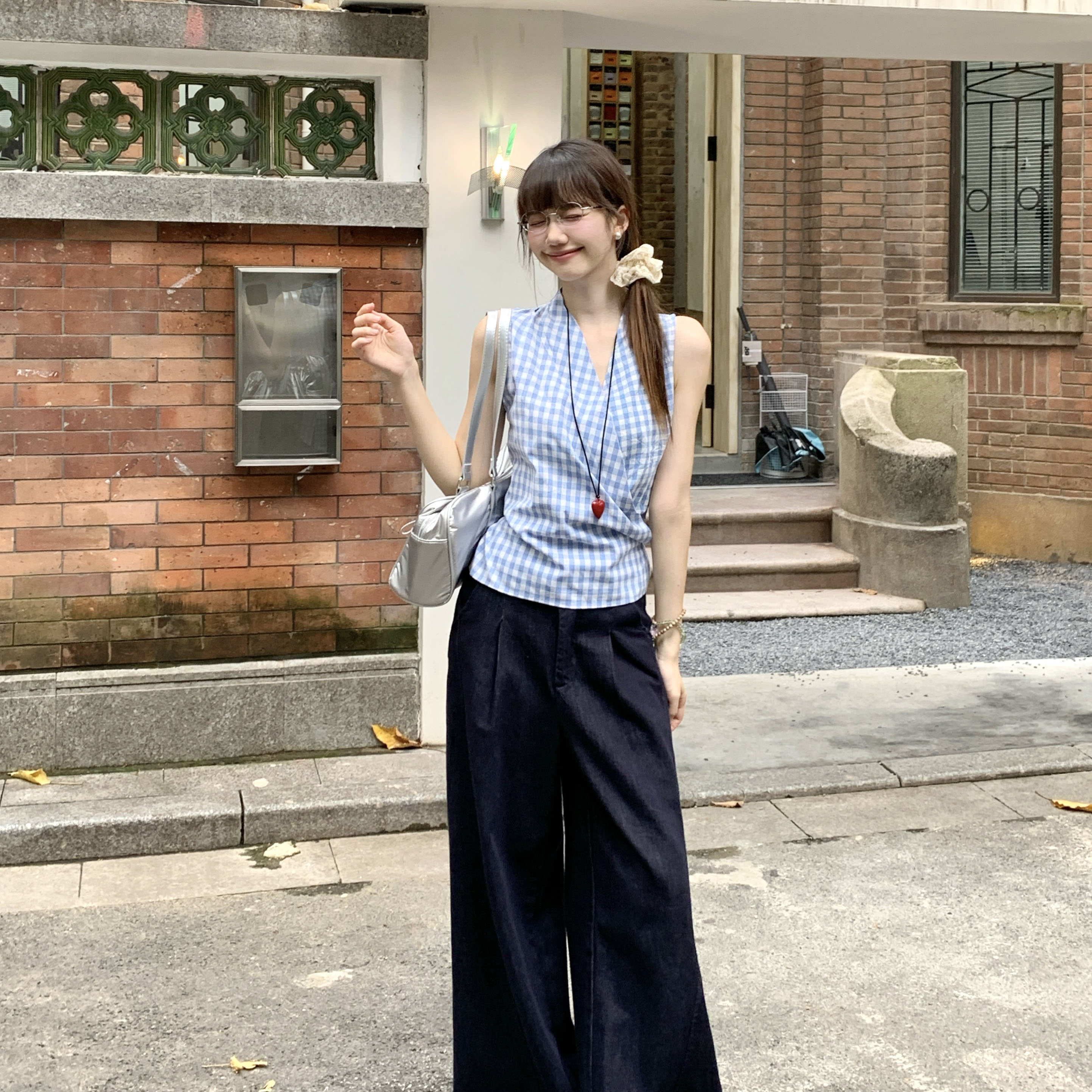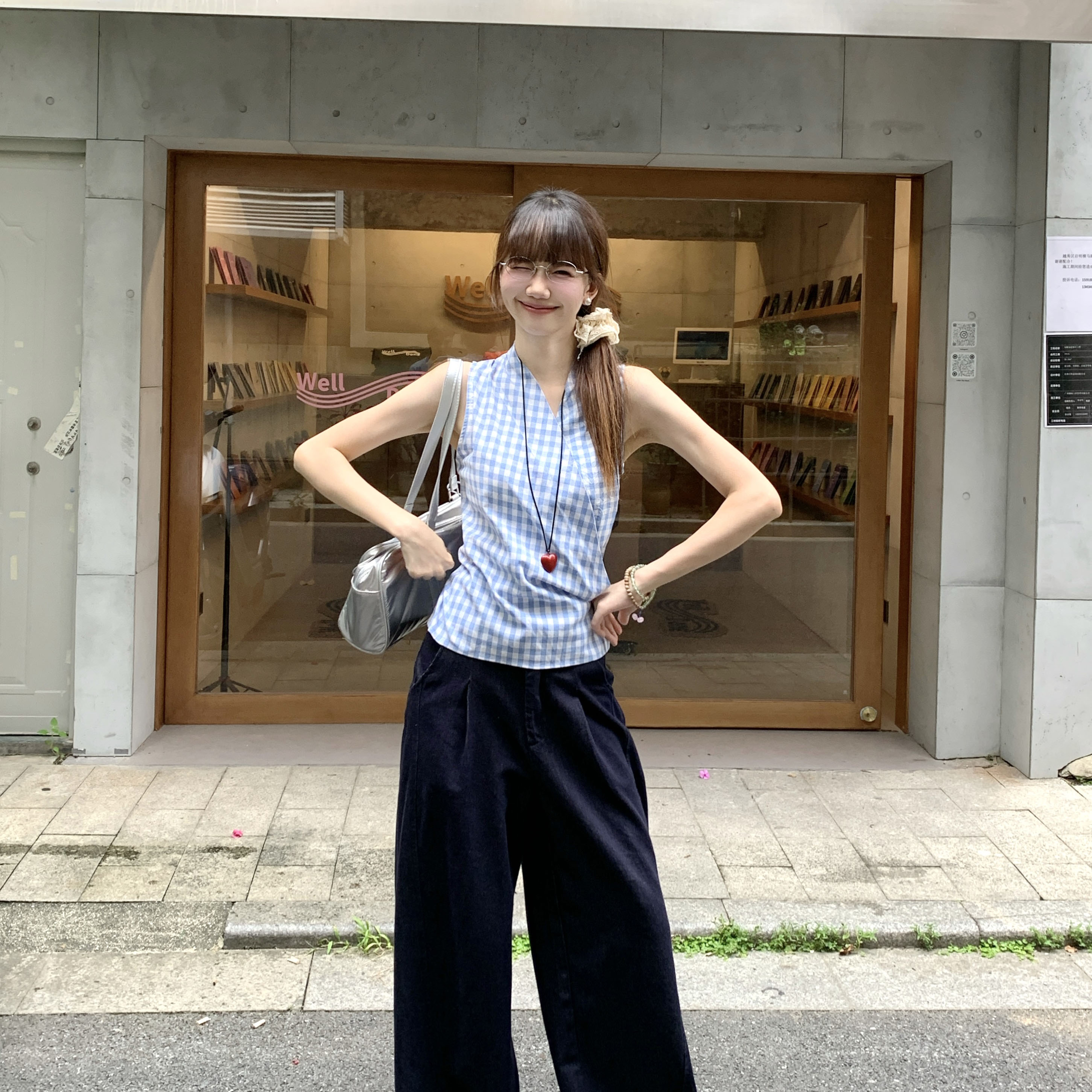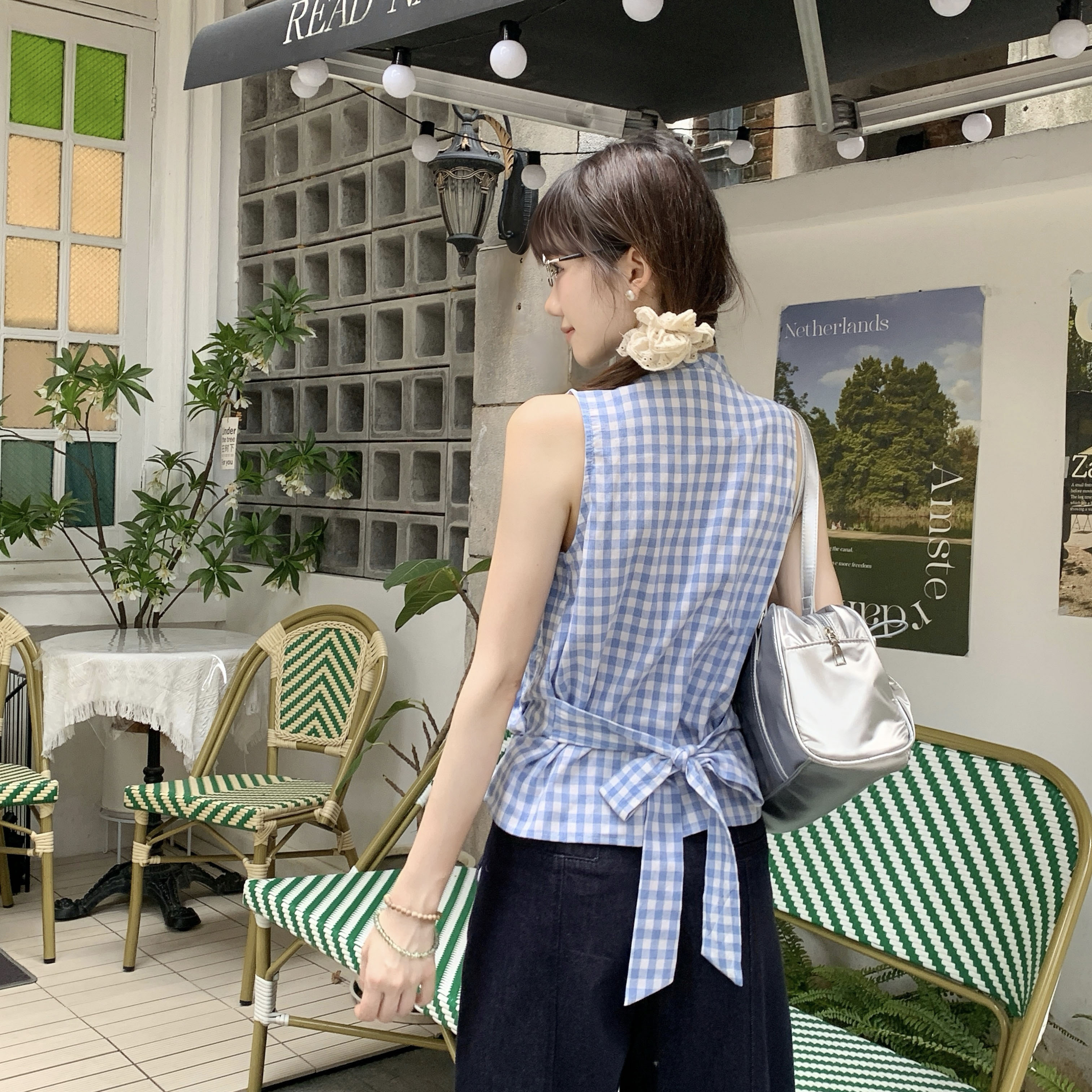 실제 샷과 실제 가격#레트로 블루 v- 넥, 격자 무늬 고삐 목 조끼 여름에 여성을위한 달콤하고 매운 스타일 슬림 셔츠 슬리빙