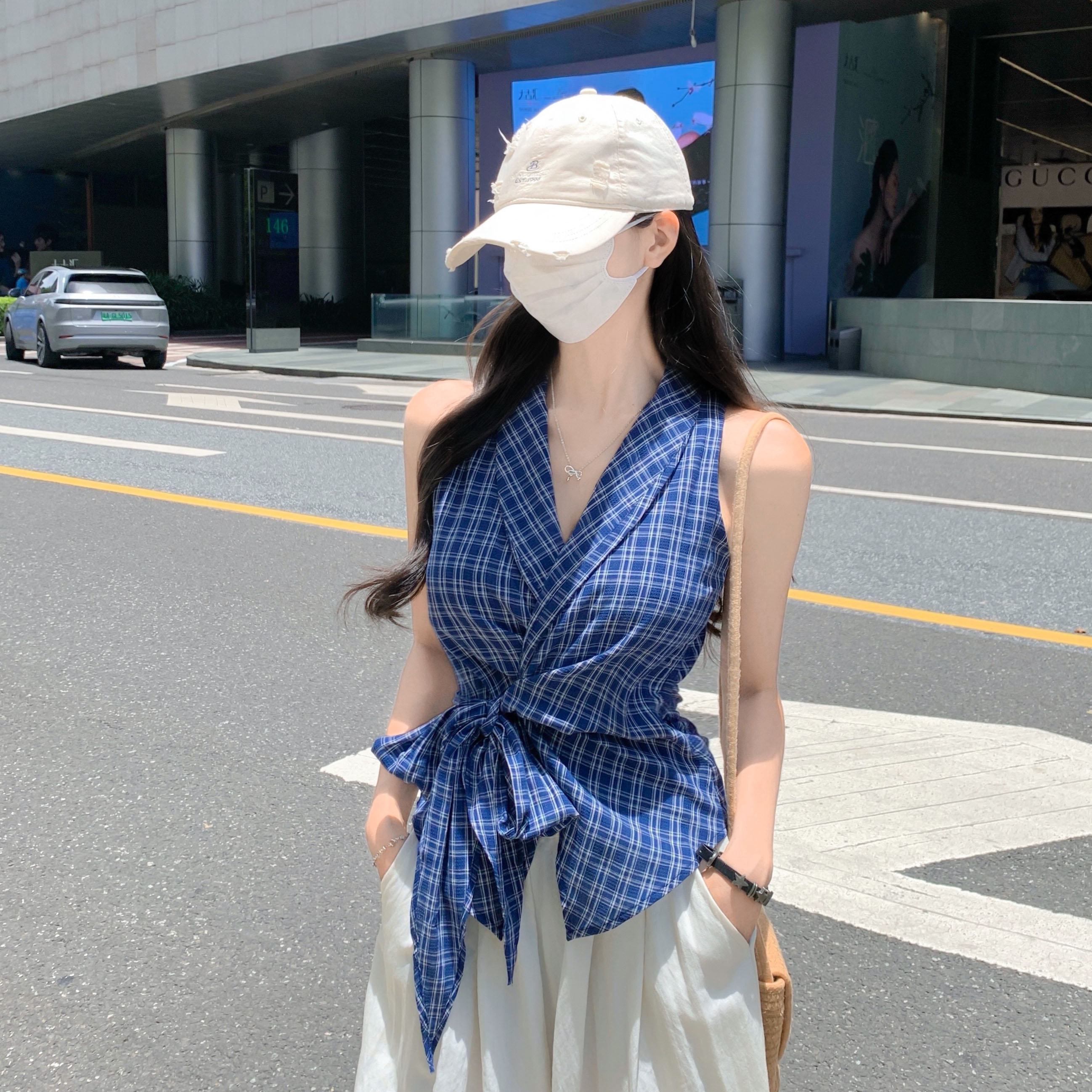 실제 사진과 실제 가격 #Blue 격자 무늬 조끼 여름에 여성을위한 2025 년 새로운 슬림 격자 무늬 핫 소녀 나비 넥타이