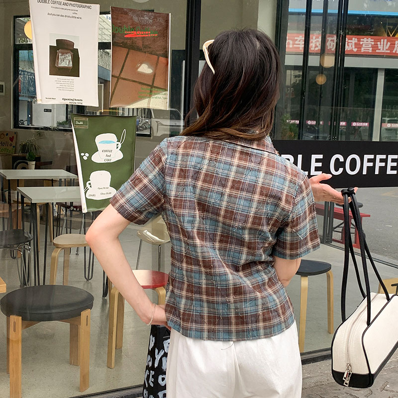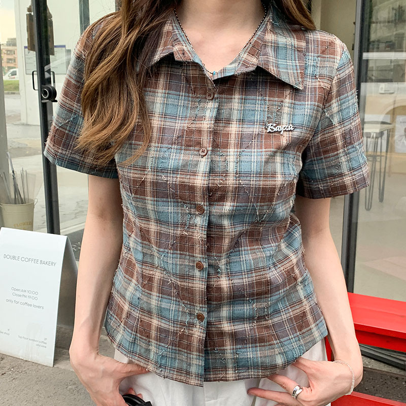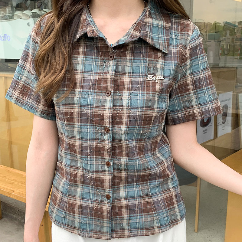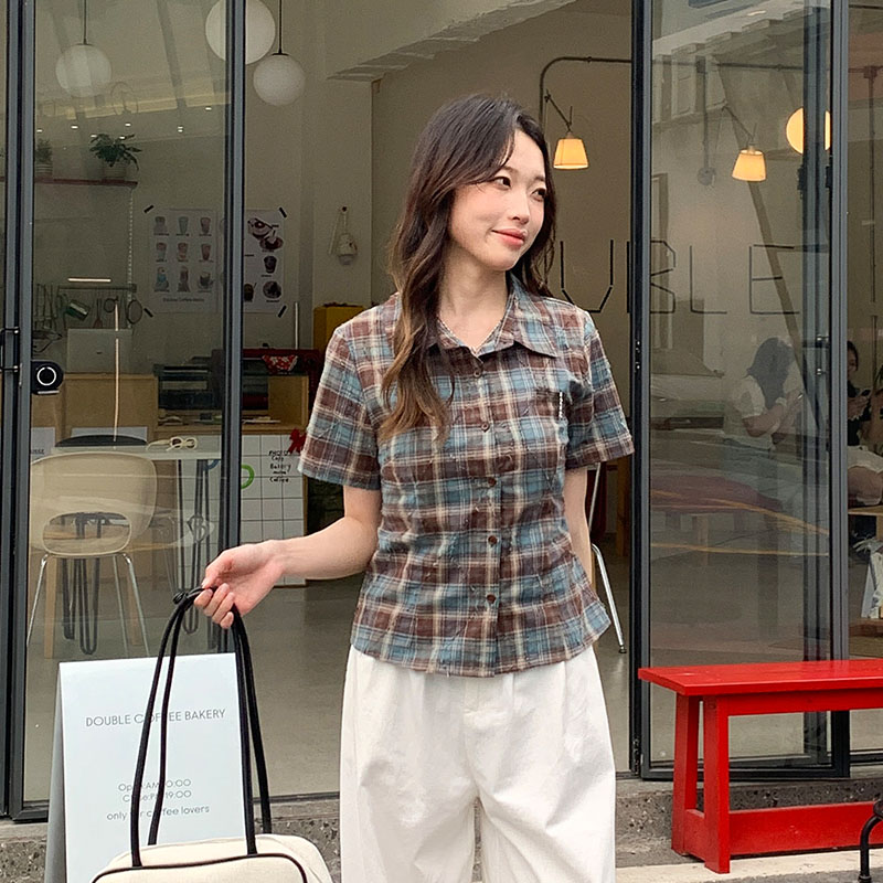 실제 가격#폴로 칼라 격자 무늬 전면 어깨 어깨 짧은 슬리프 셔츠를위한 2025 여름 슬림 슬림 반팔 탑