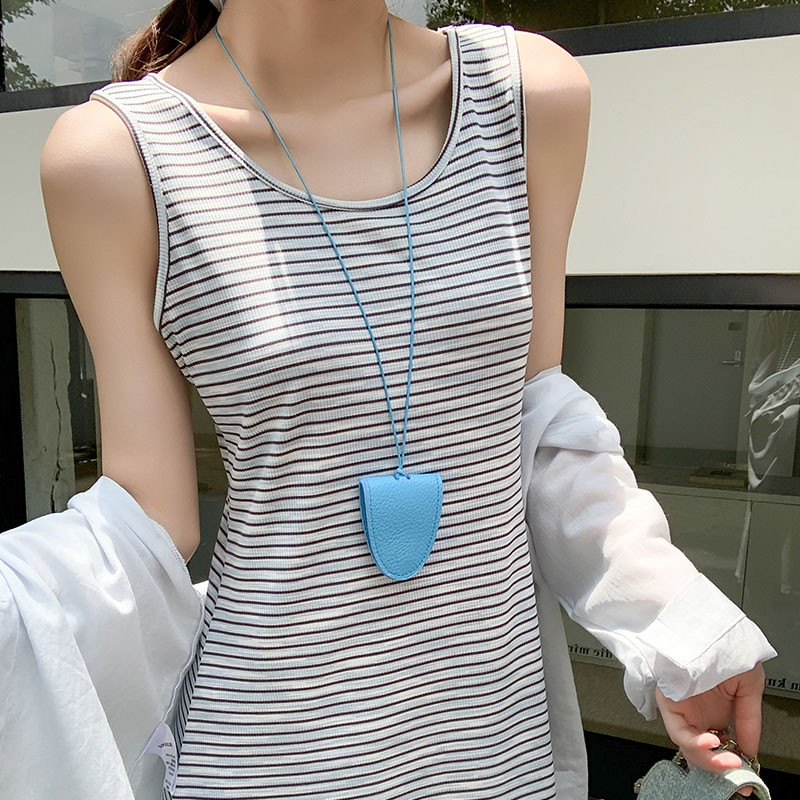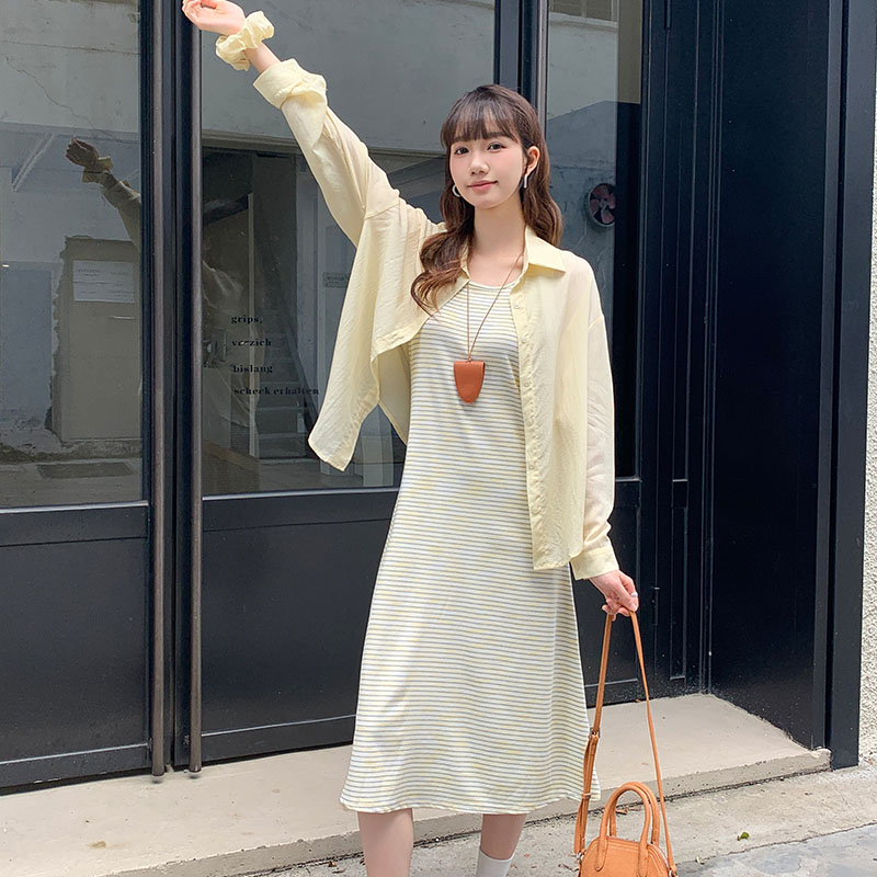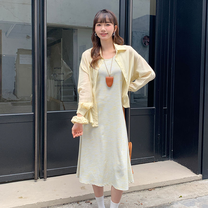 여름에 여성을위한 스트라이프 서스펜더 드레스 새로운 다목적 기질 캐주얼 슬림 허리 긴 치마