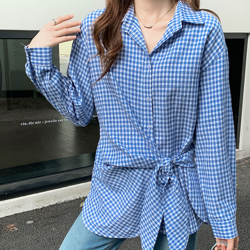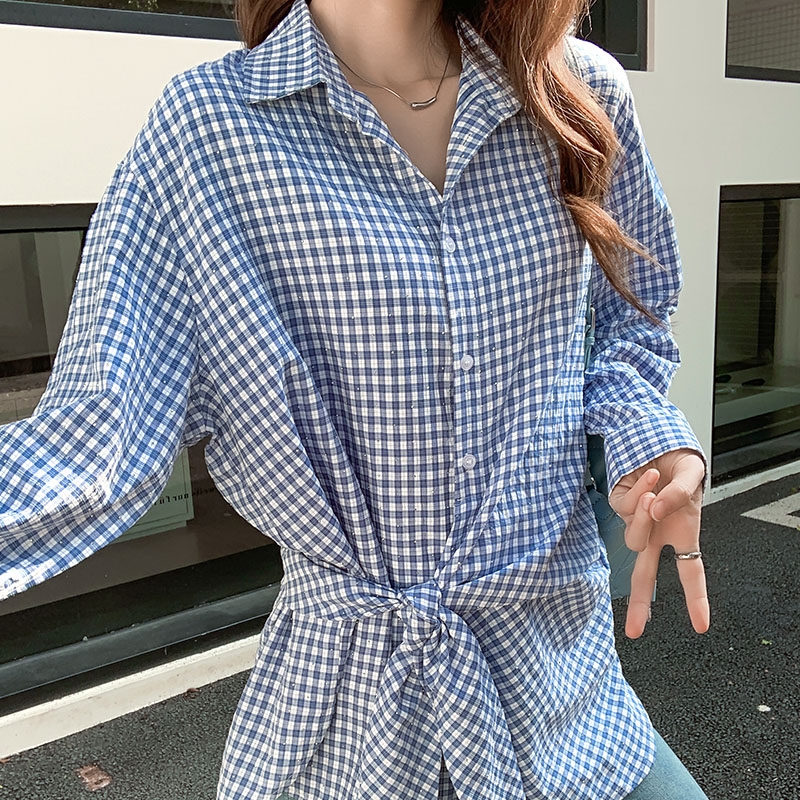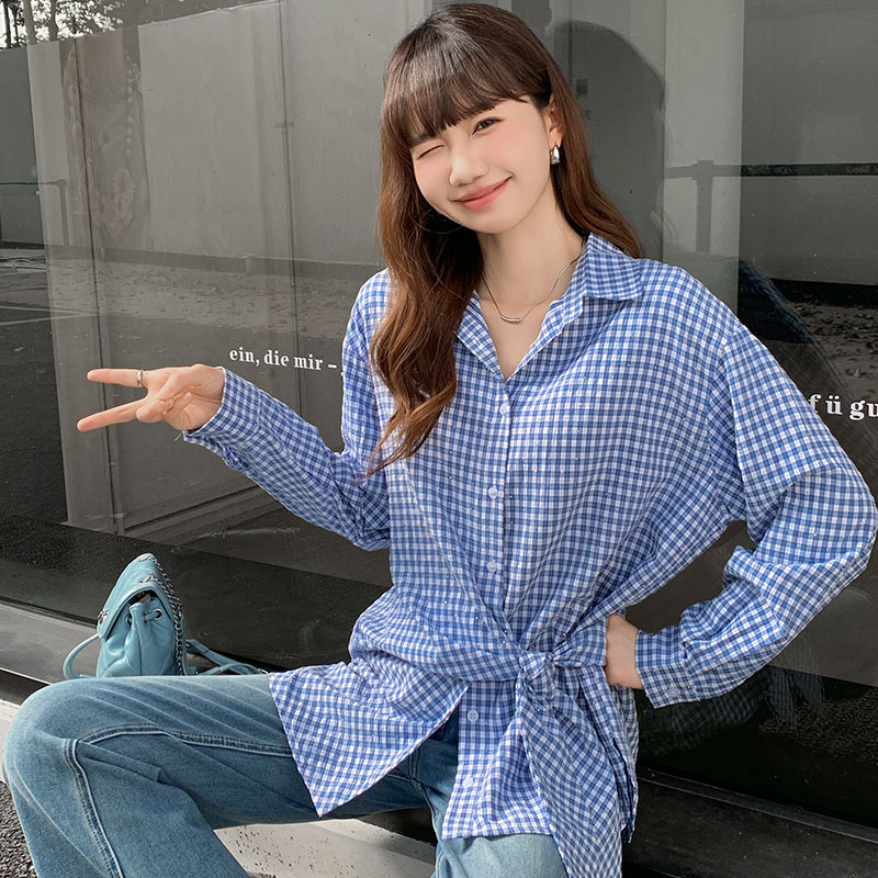 실제 가격#여성용 블루 격자 무늬 긴팔 셔츠 2025 새로운 디자인 틈새 독특한 최고 트렌드