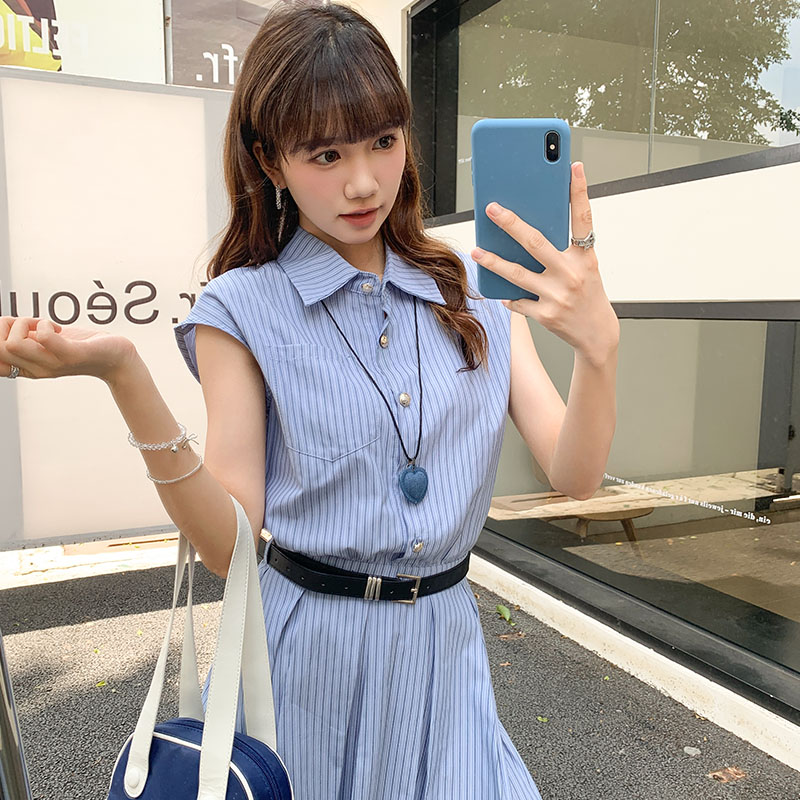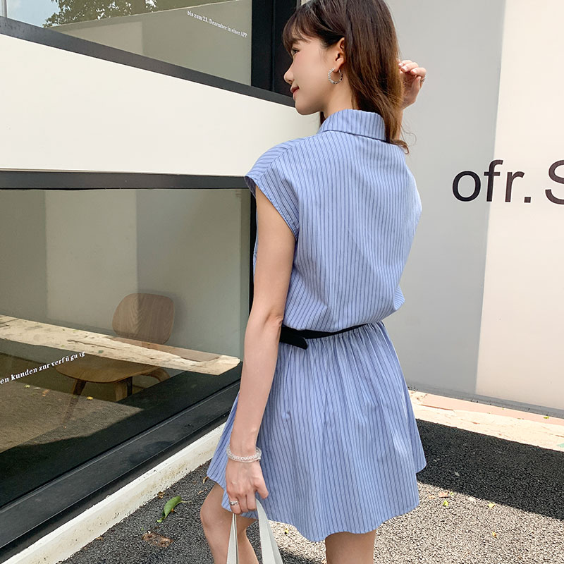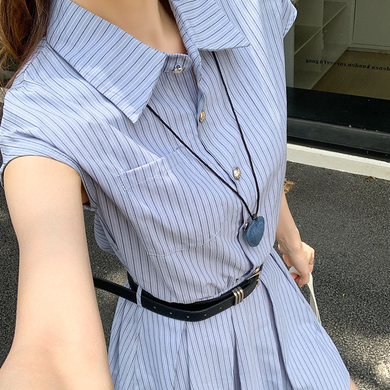 허리 라인을 잡아주는 슬림핏 스트라이프 셔츠 드레스. 여름 시즌 캐주얼하면서도 세련된 대학생 룩에 어울리는 디자인입니다.