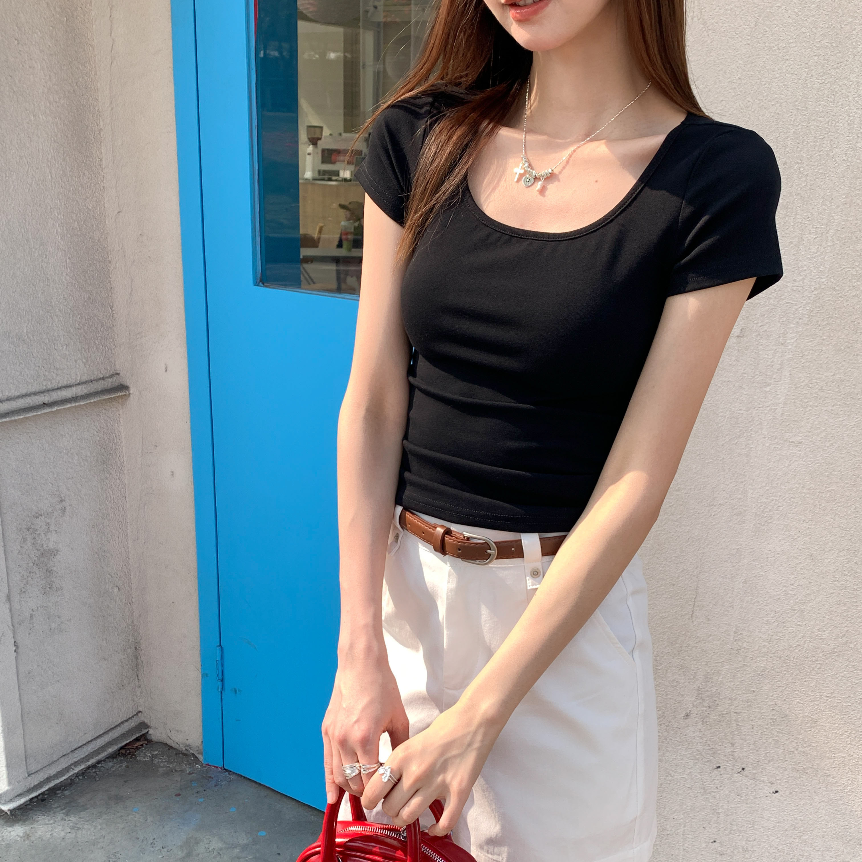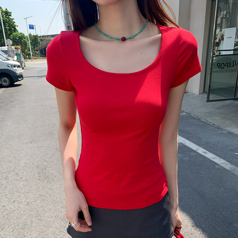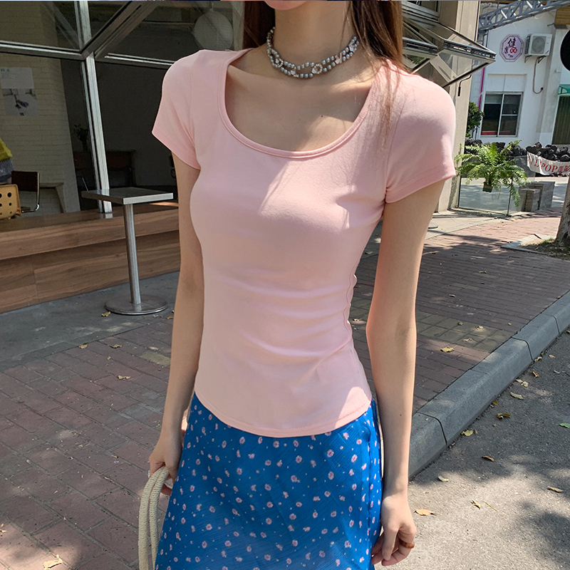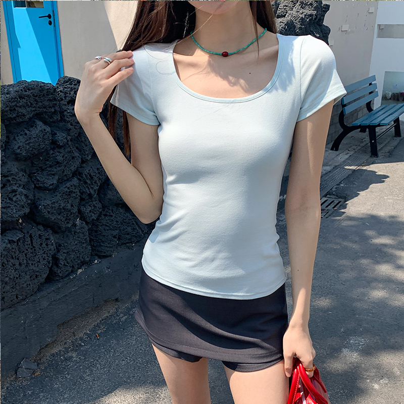 실제 가격의 사각형 칼라 단락 티셔츠 여성을위한 실제 촬영