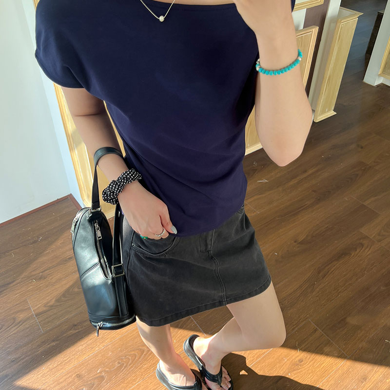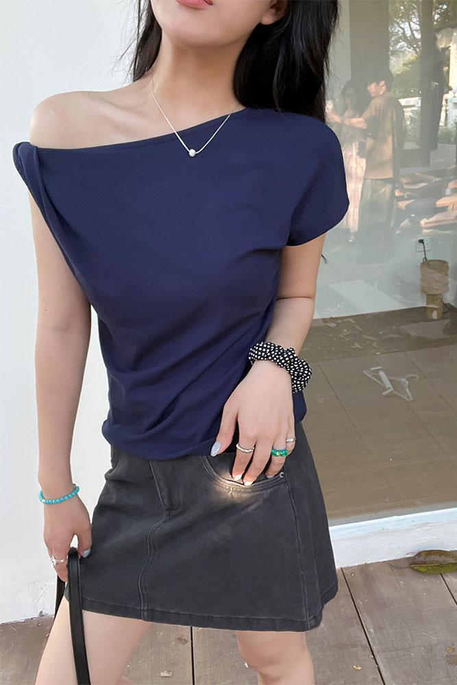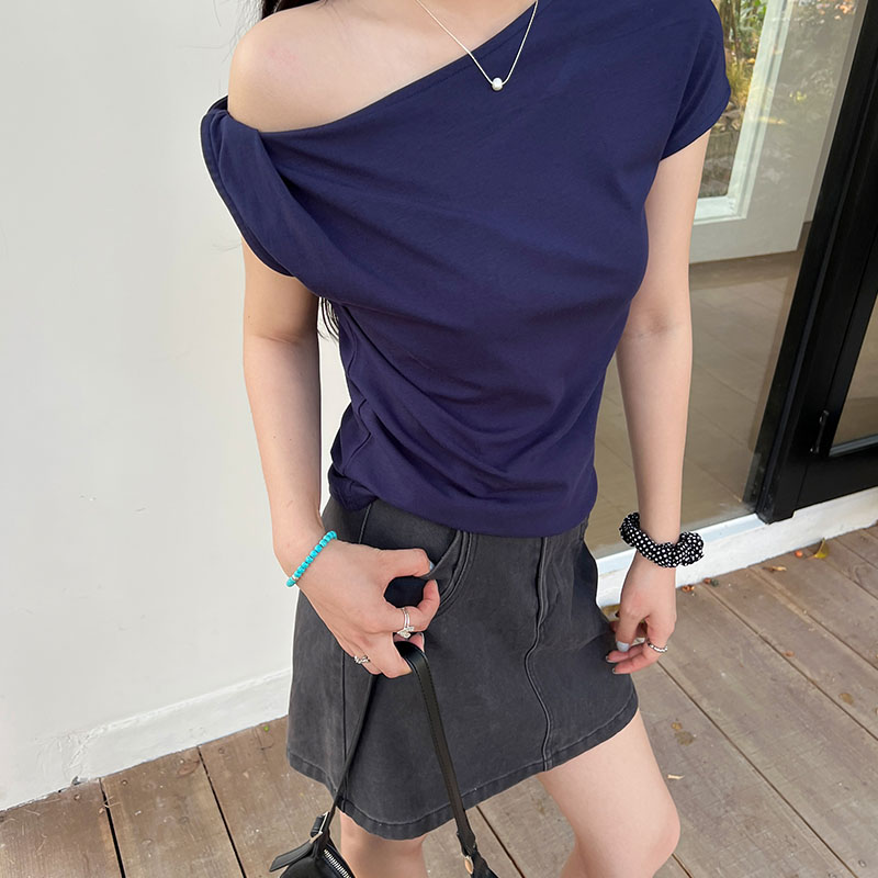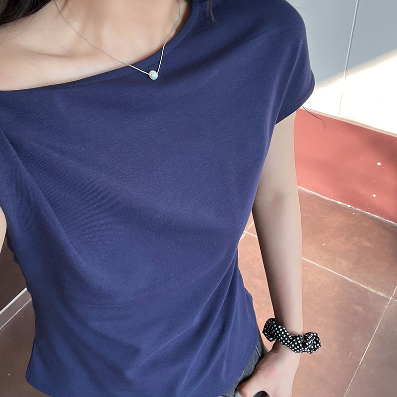 실제 수명 블루 오프 숄더 탑 2025 여름 한국 핫 걸 슬림하고 슬림 한 단색 오프 숄더 탑